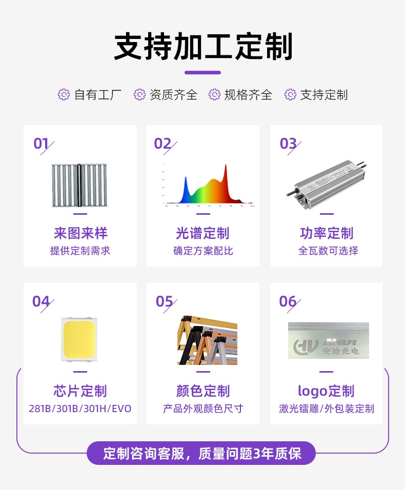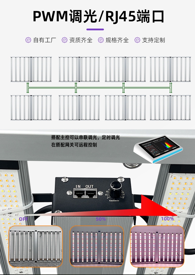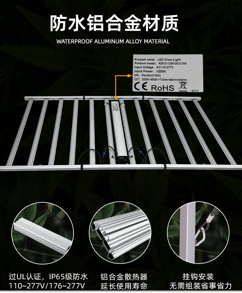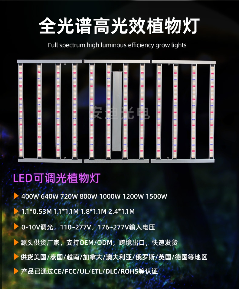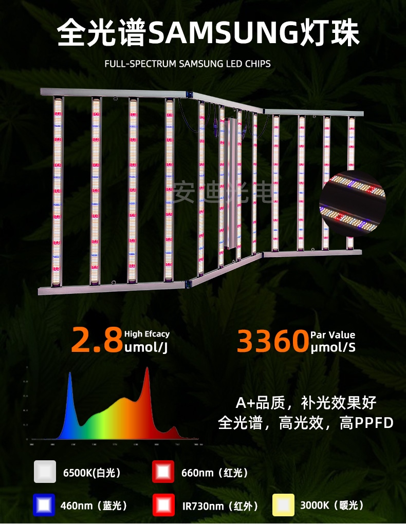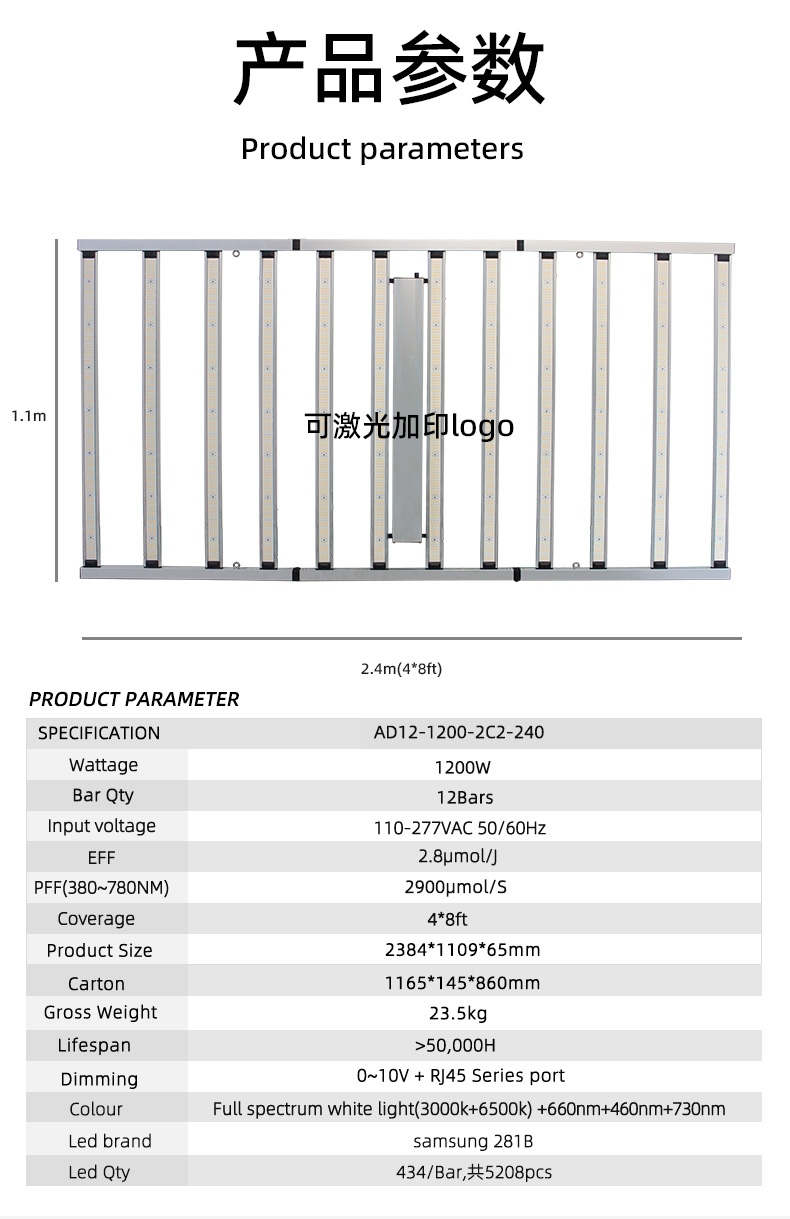 产品描述:折叠款2.4*1.1米植物生长灯12灯条0-10V可调光全光谱SAMSUNG LM281B植物补光灯 可定制301H 301B